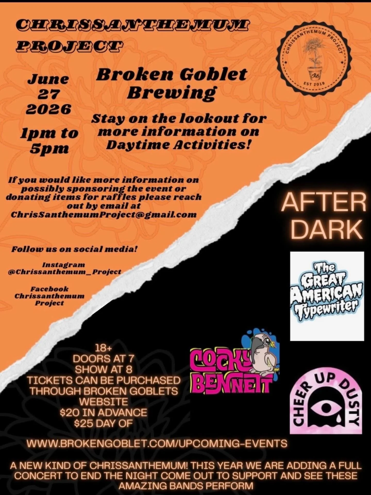 Come on out to the event to celebrate the 8th annual ChrisSanthemum Project! The event is going to be hosted on June 27 2026 in two parts at Broken Goblet Brewing! There is a family friendly portion so the whole crew can enjoy this fun filled day of awareness that will be held from 1pm - 5pm. There will also be an After Dark portion that will be ages 18+ Doors open at 7 and the show begins at 8pm.